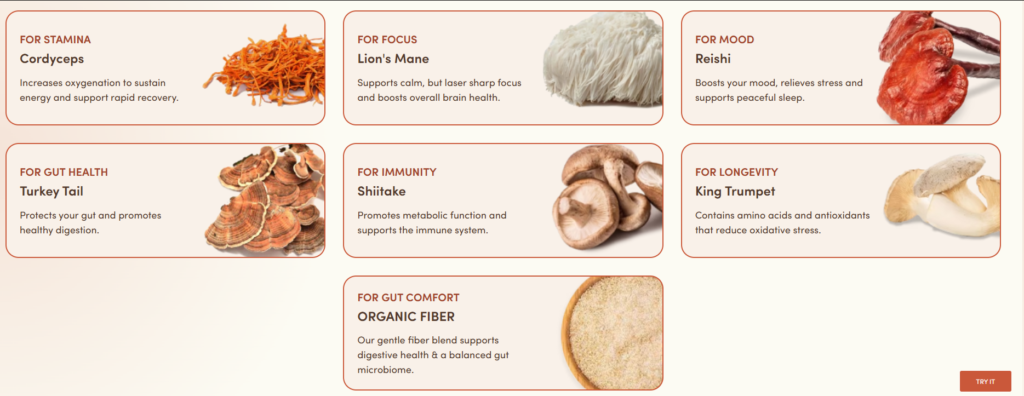 Ryze’s mushroom formula includes lion’s mane, cordyceps, reishi, turkey tail, shiitake, and king oyster mushrooms. The brand claims this blend boosts energy, enhances mental clarity, and improves gut health.
